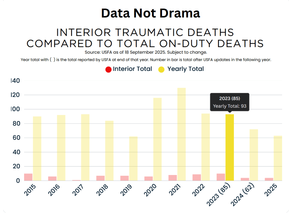 For 2023, the updates did not include any traumatic fireground deaths, which the site identifies as “interior” deaths.